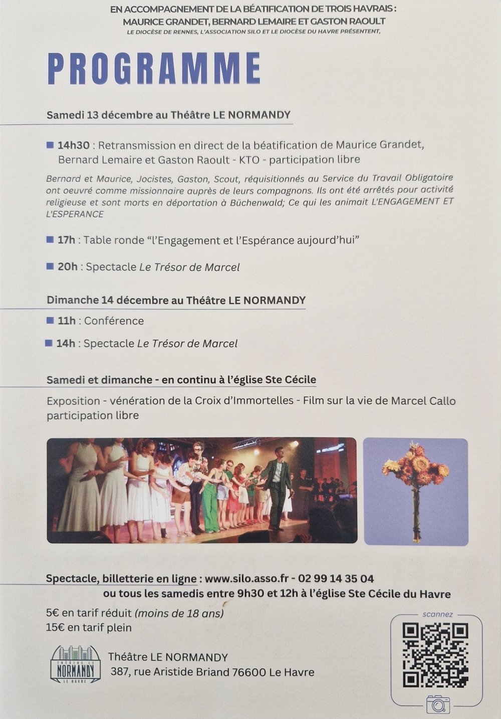 Samedi 13 décembre au théâtre Le Normandy, la béatification sera retransmise en direct, suivie d'une table ronde sur l'engagement et l'espérance d'aujourd'hui (17h) et le spectacle Le Trésor de Marcel (20h). Ce spectacle dresse un parallèle entre les questions et incertitudes auxquelles ont été confrontés Marcel Callo et ses 50 compagnons pendant la guerre et celles qui nous traversent aujourd'hui.