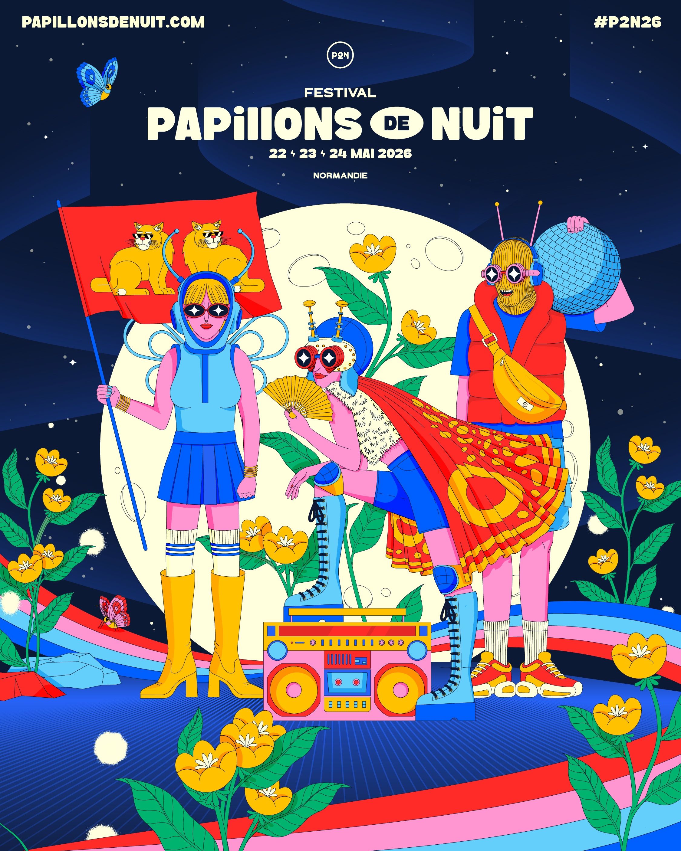 Chaque année, le Festival Papillons de Nuit soigne son identité visuelle autant que sa scène. Derrière ce dessin pop et poétique se cache une véritable lecture de l’esprit du festival entre ancrage normand, liberté artistique et célébration collective.