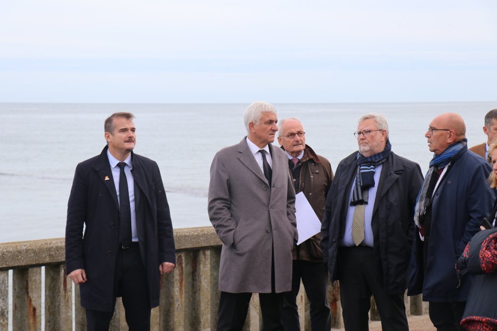 Hervé Morin a visité le chantier sur le quai Crampon jeudi 6 novembre, accompagné notamment par Patrick Thomines, président de la communauté de communes Isigny-Omaha Intercom, et Eric Poissonnière, à droite, maire de Grandcamp-Maisy.
