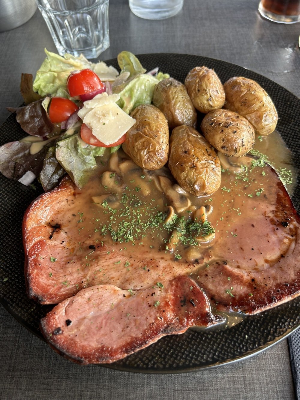 Parmi la clientèle, de nombreux salariés qui travaillent dans le secteur. Alors un pari pour l'équipe du restaurant : les servir rapidement, pour éviter que la pause déjeuner ne soit source de retard. Pari réussi, puisqu'en 45 minutes à peine, j'étais déjà en train de régler ma note. Mais n'allons pas trop vite, et jetons un coup d'œil à la carte. On y retrouve des salades, des burgers, des bruschettas, des viandes grillées… Mais surtout une formule plat du jour, dessert et café pour 18,90€. "Notre cuisine est simple, efficace, authentique, avec une spécialité pour les plats réconfortants de grand-mère", me fait saliver le chef. Quelques exemples ? "Un bourguignon, un sauté au veau, des paupiettes…" Ce midi, ce sera jambon grillé sauce madère et pommes de terre grenaille. C'est servi rapidement donc, dans une sauce généreuse et savoureuse.