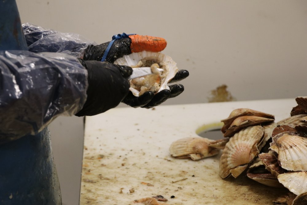 A moins de deux mois des festivités, la filière de la pêche s'active. C'est le cas des mareyeurs, intermédiaires entre les pêcheurs et les acheteurs, qui trient, préparent et distribuent les produits de la mer. Les tables de travail se couvrent de coquilles destinées à la France et à l'étranger. "On envoie ça partout en Europe, et même aux Etats-Unis", souligne Dimitri Rogoff, président du Comité régional des pêches de Normandie (CRPN), qui aspire à revoir les circuits de distribution grâce à une étude menée cette année. Le mareyeur SN Jeanne exporte ses coquilles dans tout le pays, malgré son statut de "petit" dans le milieu, un qualificatif utilisé par sa directrice, Ingrid Cano. Une dizaine d'employés y décortiquent, pèsent et emballent les Saint-Jacques achetées le matin à la criée. "La pêche est bonne", sourit Ingrid Cano. Une impression confirmée par Dimitri Rogoff : "En une heure et demie, certains ramènent jusqu'à deux tonnes de coquilles." Un travail soutenu pour répondre à la demande mondiale "d'un produit gastronomique très prisé", selon le président du CRPN.