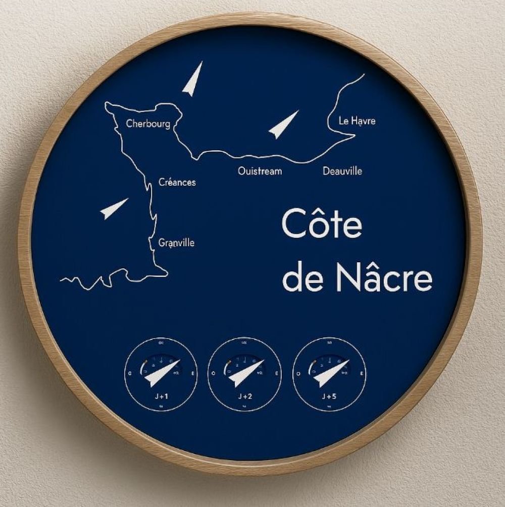 Depuis la fin de l'année 2023, le Normand travaille sur ce projet et les choses avancent. "Le système est complexe, mais il marche !" assure l'inventeur de 35 ans. Dans l'horloge se cache une petite carte connectée à Météo France, par le Wi-Fi du domicile. Plusieurs fois par jour, elle se met à jour en suivant un modèle météo nommé Arome qui permet d'anticiper les conditions sur 72h de manière précise. "Ça se matérialise sur l'horloge par une aiguille qui indique la direction du vent du jour et des suivants, une petite jauge qui donne la force du vent établi, en nœuds, et une autre qui donne la force des rafales. Avec ça, on a l'essentiel des données qui nous permettent de savoir s'il y aura des conditions intéressantes dans les trois prochains jours", promet Antoine de Joybert. Côté design, le fond de chaque cadran représentera la ligne de côte que désire le client. Qu'elle soit en Normandie, ailleurs en France, ou même dans le monde !