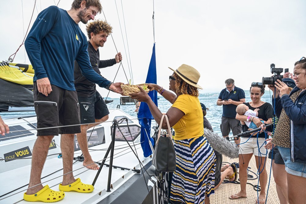 Après près de 20 jours de course, Fabien Delahaye et son coskipper sont accueillis avec des fruits frais. - Jean-Louis Carli - Alea