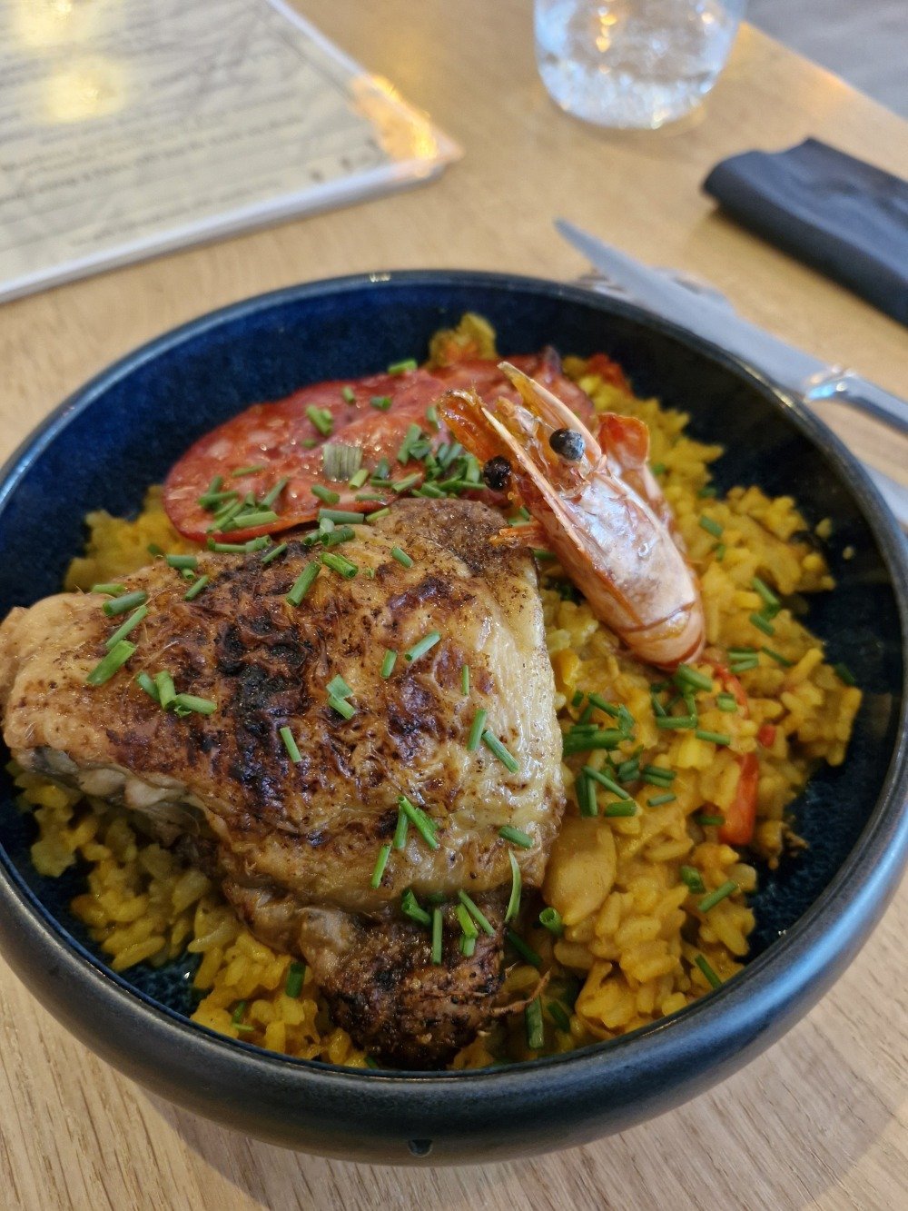 En entrée, un généreux tartare de saumon, bien assaisonné permet de bien être mis en appétit. Car c'est un grand classique qui est proposé ensuite : une belle portion de paëlla, traditionnelle avec ses fruits de mer et son poulet. Un plat réconfortant, parfumé et roboratif.