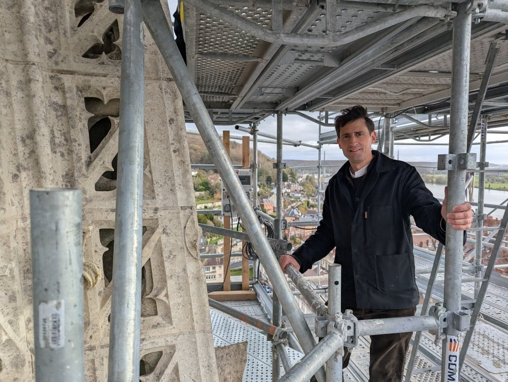 "C'est le patrimoine de tous et un élément touristique important", rappelle Bastien Coriton, maire de Rives-en-Seine, qui comprend Caudebec-en-Caux, port d'escale pour le tourisme fluvial. Cette phase de chantier, évaluée à plus de 3,5 millions d'euros, s'étalera pendant environ trois ans. Après la flèche, les travaux se poursuivront sur les parties basses du clocher, jusqu'à sa base, comprenant notamment un cadran solaire et lunaire… "Le petit Gros Horloge de Caudebec !", sourit le maire. L'Etat, le Département et la Région aident au financement, ainsi que la Fondation du patrimoine dont la cagnotte est toujours ouverte.