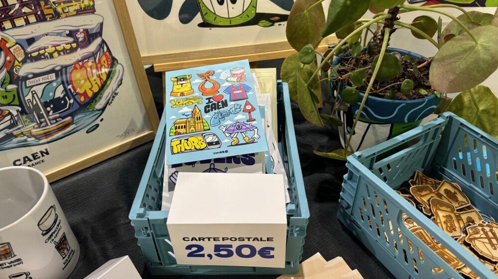 Sur le stand de l'illustrateur, qui a signé l'affiche de la Foire internationale de Caen 2025, édition du Millénaire, vous pouviez y retrouver de nombreux objets pour ravir les amoureux de la ville aux cent clochers : tableau sur le film Yoroï d'Orelsan, tote bag et cartes postales en hommage à Caen.