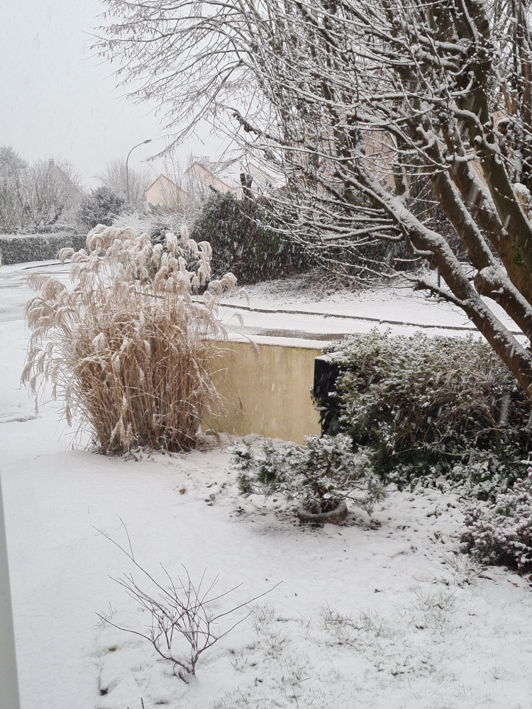 Il y a déjà une belle couche de neige dans ce jardin de Port-Jérôme-sur-Seine en Seine-Maritime, où les flocons continuent à tomber.