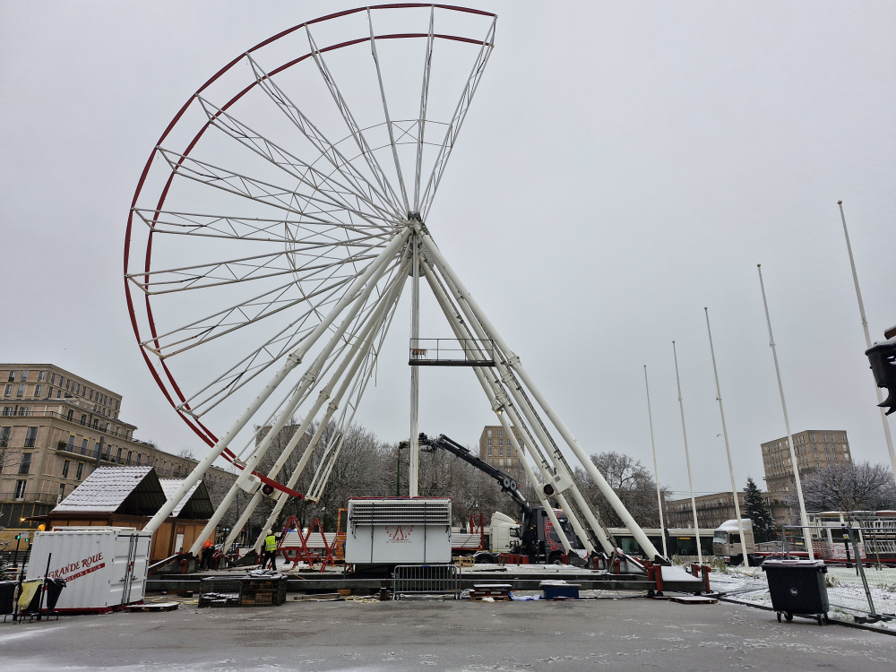 Au Havre, si vous espériez profiter de la grande roue pour admirer la ville sous la neige, c'est raté ! Elle est en cours de démontage. Fastidieux travail dans le froid...