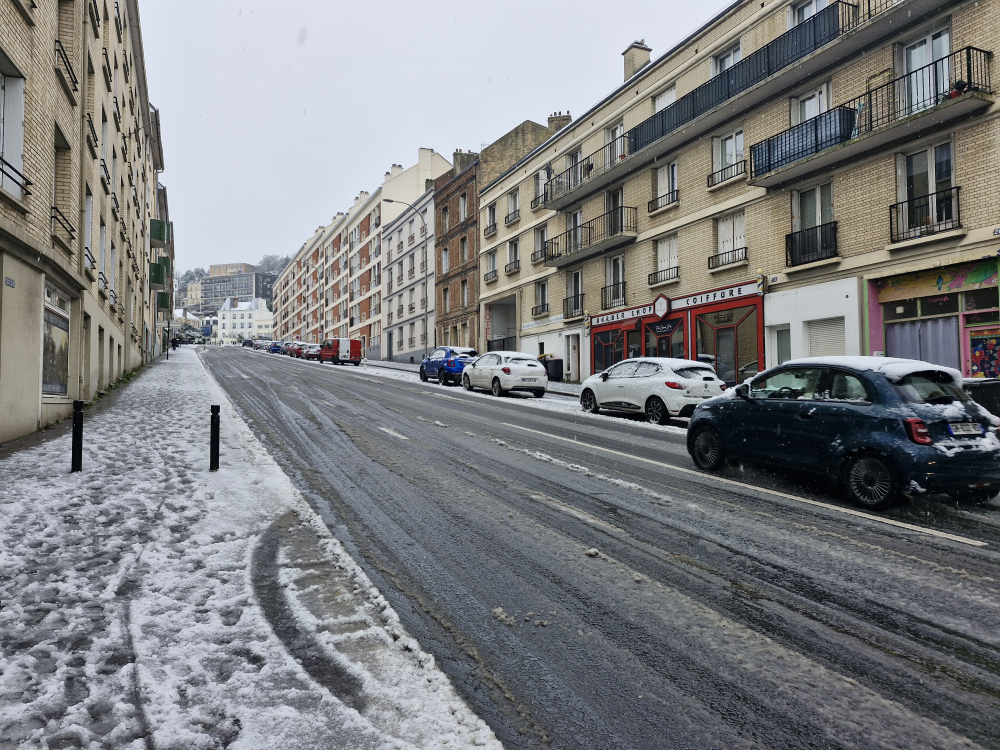 A Bois-Guillaume, sur les hauteurs de Rouen, les flocons tiennent particulièrement bien. La couche de niege est déjà épaisse sur les routes et dans les jardins.