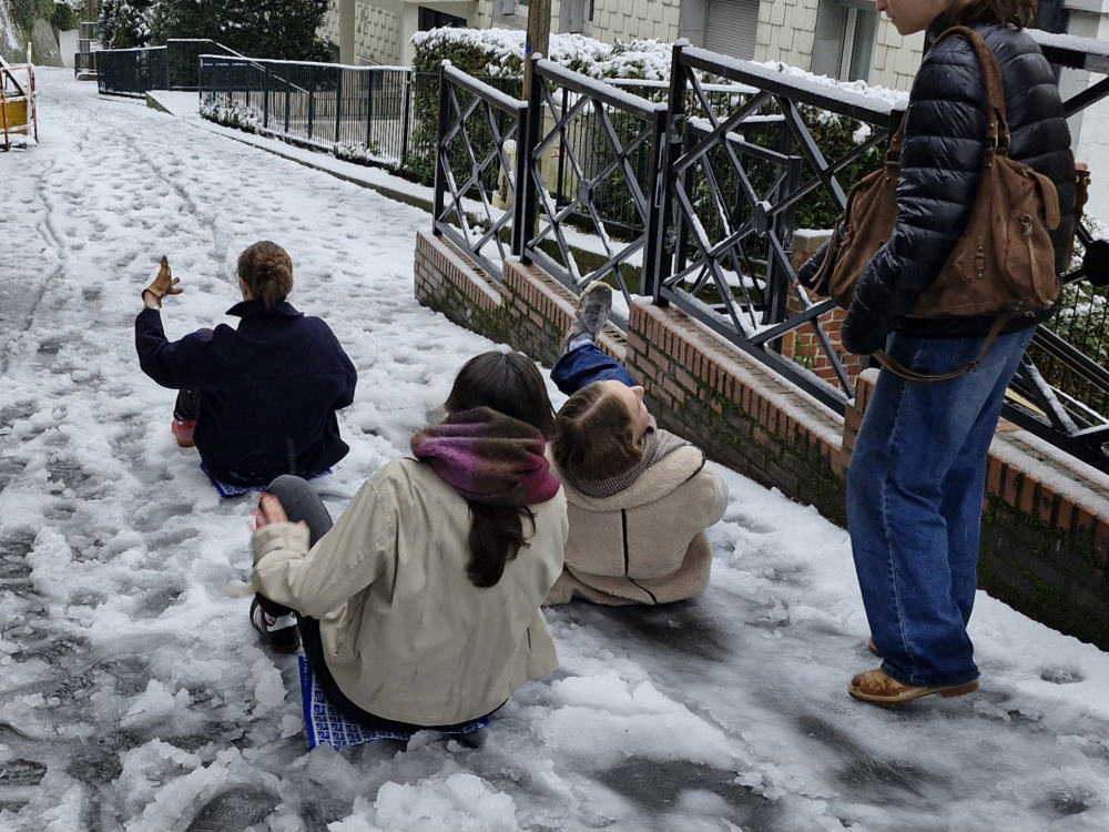Pas de luge ? Ces lycéennes du Havre improvisent une piste de glisse avec... des sacs plastiques ! Récréation bienvenue avant de reprendre les cours.