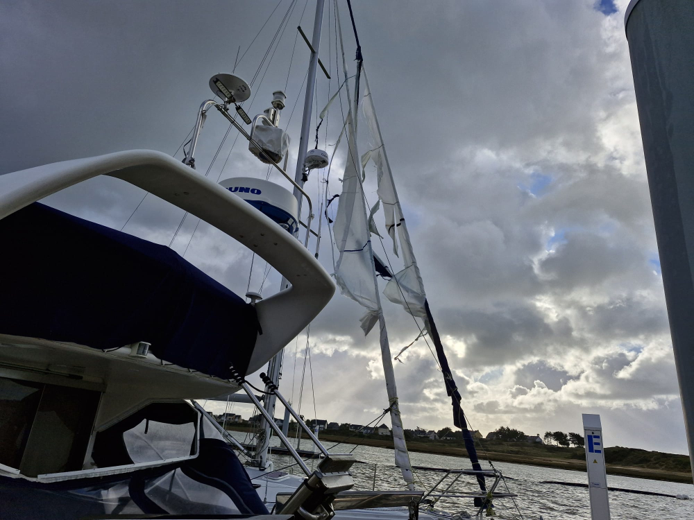 Au port de Carteret, dans la Manche, nuit plutôt tranquille pour les bateaux... sauf pour ce voilier, à la voile déchirée.